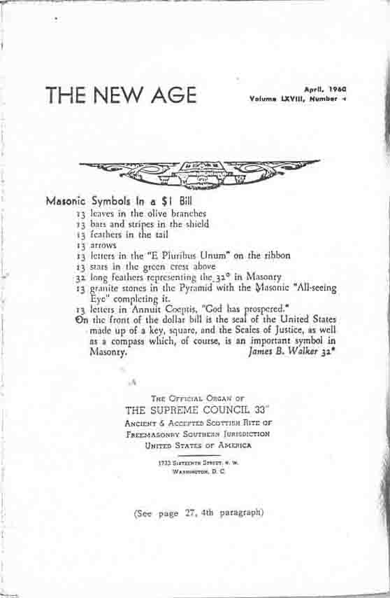 The image below is taken from 'The New Age' magazine which was the official publication of the Supreme Council of the 33rd Degree of Freemasonry, the most powerful Masonic organization in the America if not the world. It is now called the 'Scottish Rite Journal'. It is from April 1960 and it clearly states that the $1 note is covered in Masonic symbols and it also states "Pyramid with the Masonic All Seeing Eye"