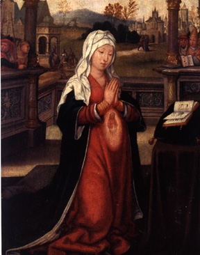 In 1854, Pope Pius IX's solemn declaration, Ineffabilis Deus, clarified with finality the long-held belief of the Church that Mary was conceived free from original sin. In proclaiming the Immaculate Conception of Mary as a dogma of the Church, the pope expressed precisely and clearly that Mary was conceived free from the stain of original sin. This privilege of Mary derives from God's having chosen her as Mother of the Savior; thus she received the benefits of salvation in Christ from the very moment of her conception. (The picture above shows her mother, Anna, with the infant Mary within her womb). This great gift to Mary, an ordinary human being just like us, was fitting (according to Catholicism) because she was destined to be Mother of God. Thus, Catholics believe that the purity and holiness of the Blessed Virgin Mary is a model for all Christians (Catholics).