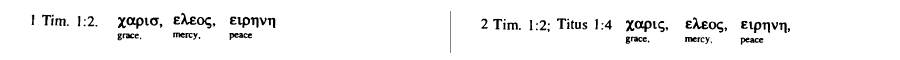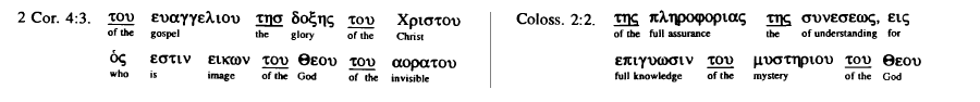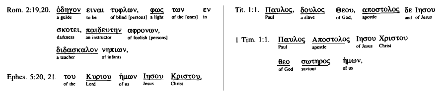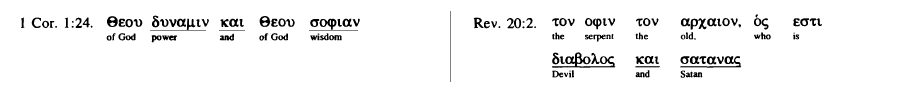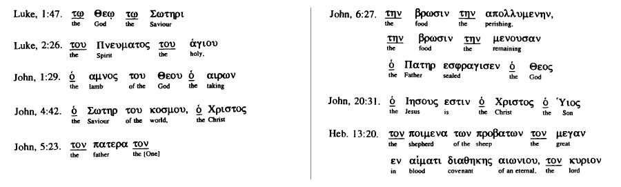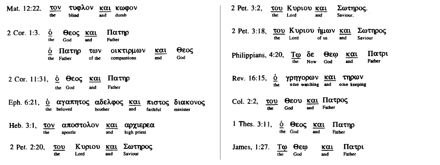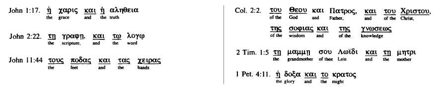 Rule I. When the copulative kai connects two nouns of the same case, [viz. nouns (either substantive or adjective, or participles) of personal description respecting office, dignity, affinity, or connection, and attributes, properties, or qualities, good or ill,] if the article ho, or any of its cases, precedes the first of the said nouns or participles, and is not repeated before the second noun or participle, the latter always relates to the same person that is expressed or described by the first noun or participle: i.e. it denotes farther description of the first-named person, as - ![]() And there is no exception or instance of the like mode of expression, that I know of, which necessarily requires a construction different from what is here laid down, EXCEPT the nouns be proper names, or in the plural number; in which cases there are many exceptions; though there are not wanting examples, even of plural nouns, which are expressed exactly agreeable to this rule. ... The rules which follow are intended only to illustrate the particularity of the several sentences which fall under the first rule, by showing, in other sentences, the different senses that are occasioned by adding, omitting, or repeating, the article, as well with the copulative as without it.