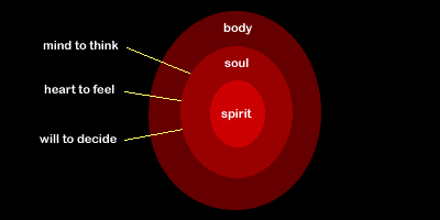 To help teach you about the human soul, I made the above image using Macromedia's Fireworks program (version 4). The program allows you to work in layers, so each circle and text is a separate layer. Pretty neat stuff. I used Fireworks to make my Jesus-is-Savior.com image years ago in March of 2003.