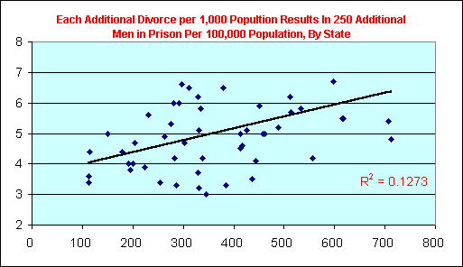 The 13 fold increase in the divorce rate this century paralleled an unprecedented 8 fold increase in our murder rate. Around the world today, in 15 industrialized nations, 100 additional divorces cause one additional murder, 6 additional reports of rape, 33 additional armed robberies, and 100 more men in prison. These are costs which society, not feminists, must pay. Putting one man in prison removes 2 men from the labor force (the inmate and one more criminal justice system employee), plus adds the cost of the employee's salary and benefits to the already overburdened Public Debt. This is a net cost to GDP of 3 man-years, so having 1.8 million men in prison subtracts 4.8 million man-years from GDP, which is 4%. If we had an incarceration rate equivalent to Japan or China, we would be spending 0.2% of GDP for prisons, which means that mopping up after feminists puts the entire US workforce at an immediate 3.8% cost disadvantage in the Global Economy.