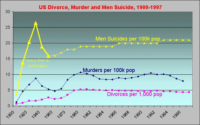 The increase in our murder and suicide rates correlates closely to the increase in our divorce rate, which is clearly the result of granting American women legal rights.
