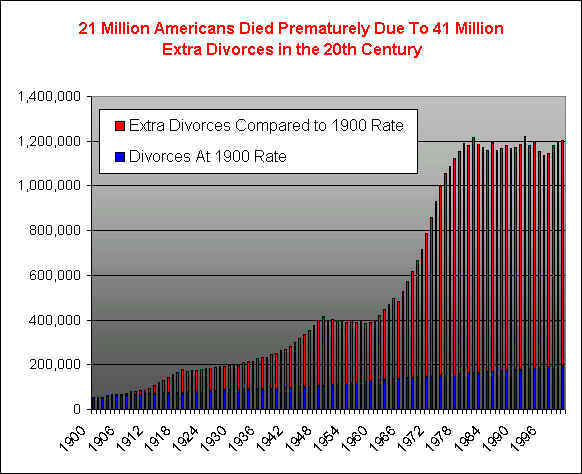 21 million Americans died as a direct result of this increased divorce rate, including one million divorce related suicides and one million divorce related homicides in the 20th Century alone.