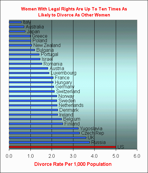 The tendency of women to divorce increases as their legal rights are increased. Countries which have not granted legal rights to women have divorce rates one tenth as high as the US.