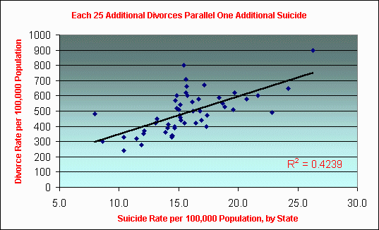 Within the US, state to state divorce and suicide rates demonstrate that there is one additional suicide for each additional 25 divorces. In other words, when a judge grants 25 divorces, he is directly responsible for one additional suicide in this country.