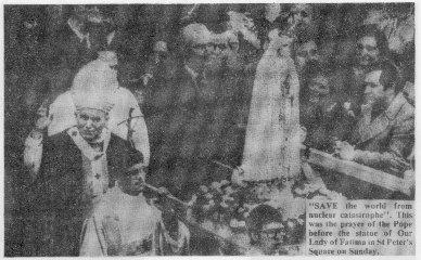 In spite of all denials of idolatry, Romish handbooks and manuals of worship clearly expose the facts. In the Good Friday Service of Adoration of the Cross, we read:- "Behold the wood of the Cross -- Come let us adore ... We adore thy Cross ... Sweet wood, sweet nails ... Hail then, 0 Cross!" During a recent visit to St. Patrick's Roman Catholic Cathedral, New York, I came across the following prayer to Saint Theresa:- "Saint Theresa who ... became a mirror of angelic purity ... cast a glance of pity on us as we leave all things in thy hands. Make our troubles your own, speak a word for us to our Lady Immaculate ... beg her as Queen ... by her powerful intercession, to obtain for us the graces we yearn for." The devotion goes on:- "Little Theresa of the Child Jesus, remember your promise to make good things on earth. Drop your shower of roses over all in need." To add to this blasphemy, we are told:- "The person who finds this prayer should copy it 20 times, and bring it to a church each time. On the 11th time, your prayers will be answered." Romish idolatry reaches a height in the worship of the Virgin Mary. The present Pope John Paul II has made a point of visiting idolatrous Marian Shrines world wide, to show his devotion. In May 1982 before coming to Britain, he visited the Fatima Shrine in Portugal to show his gratitude to Our Lady of Fatima for saving his life a year earlier from assassins, and on March 25th, 1984, he held a special ceremony in Rome to consecrate the entire world to Mary. Special groups are set up inside Roman Catholicism to encourage Marian devotion e.g. The Legion of Mary, The Archcon fraternity of Our Mother of Perpetual Help, The Central Association of the Miraculous Medal, and the Blue Army of Our Lady of Fatima. Roman Catholics are encouraged to participate in the Rosary devotions in which ten time as many prayers are given to Mary as to God. The book "The Glories of Mary" by the Roman Catholic Saint Alphonsus Liguari, goes as far as to state:- "We often obtain more promptly what we ask by calling on Mary than on Jesus." We could go on to give many more examples of blasphemous and idolatrous